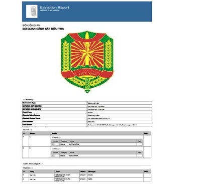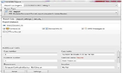 Thực hiện phân tích dữ liệu và tạo báo cáo Để xem và phân tích dữ liệu đã trích xuất, ta dùng ứng dụng UFEDPhysical Analyzerkèm theo bộ Cellebrite UFED, mỗi bộ Cellebrite UFED có 1 key bản quyền dạng USB để sử dụng cho phần mềm này. -Cắm key này vào cổng USB và mở ứng dụngUFED Physical Analyzer - Từ trình đơn Menu, chọn File>Open, hoặc kích nút Open trên thanh công cụ. - Tìm đến vị trí của tập tin cần khai thác, file cần lựa chọn có định dạng *.UFD - Toàn bộ thông tin trích xuất hiển thị ở cột bên trái của ứng dụng, trong đó có đầy đủ các thông tin đã trích xuất, như: Contacts, SMS Messenger, Image, Videos, Audio, Text… - Thực hiện tạo báo cáo, in kết quả để làm chứng cứ cho vụ án đang tiến hành. Ta có thể tạo ra một báo cáo tóm tắt tất cả các thông tin tìm thấy trong thiết bị đã trích bằng các cách: Lựa chọn Report>Generate Reporttừ thực đơn menu Hộp thoại Generate Report hiển thị bao gồm các lựa chọn sau: - Report Type: Định dạng tập tin báo cáo. Có các định dạng: HTML, MS Excel (*.xlsx), XML, hoặc PDF. - Thẻ Report Data: + Report Dataset:Lựa chọn nội dung cần thể hiện trong báo cáo: SMS Messages, Contacts, Audio, Image, Videos + Additional Fields: Các thông tin cần thiết được bổ sung bởi người dùng: •Case number: Mã số vụ án. •Case name: Tên vụ án •Evidence number: Mã số chứng cứ •Examiner name: Tên người lập báo cáo. •Department: Tên cơ quan, đơn vị lập báo cáo •Location: Địa chỉ •Notes: Ghi chú Nhập các nội dung cần thiết khác và kích nút Generate để xuất báo cáo. Một báo cáo sẽ thể hiện như hình bên. Chú ý: - UFED thường cập nhật thiết bị mới. Do đó, cần tiến hành kết nối UFED với internet để tiến hành cập nhật theo hướng dẫn. - UFED có khả năng trích xuất được khoảng 90% loại thiết bị trên thị trường. Do vậy, với những thiết bị không được hỗ trợ, cán bộ kỹ thuật cần thực hiện phương pháp khác để thu thập, phục hồi, phân tích dữ liệu để chuyển hóa thành chứng cứ.