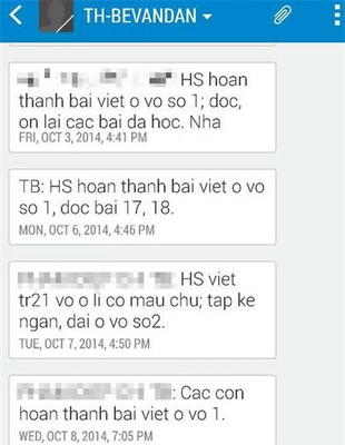 Chia sẻ với chúng tôi, chị Minh, có con học lớp 1, trường tiểu học Bế Văn Đàn (quận Đống Đa, Hà Nội) cho biết, vợ chồng chị bị "tẩu hỏa nhập ma" vì chương trình học của con. Mới hơn một tháng mà bé Bin (con chị Minh) đã phải học hết bảng chữ cái, tập viết từng chữ và song song học ghép từ. Cùng một chữ nhưng cách viết trong sách và vở đánh vần của bé lại khác nhau (cùng một chữ L nhưng viết là l và chữ l có móc) khiến bé không phân biệt được. Bin không thể nhớ nổi những chữ ghép như: Ch, gh, ng, nhưng bài đọc lại yêu cầu đọc đến 3 dòng, toàn những từ đôi. Từ môi trường mẫu giáo chỉ biết vui chơi chuyển lên lớp 1, Bin nói sợ phải học đánh vần, viết chữ. "Vợ chồng tôi hoang mang không biết phải hướng dẫn con học như thế nào vì cách đánh vần, viết nét của học sinh tiểu học bây giờ khác trước. Con mới làm quen với số 0-9 mà đã có những bài tập khó như: Có 6 người, muốn chia thành các nhóm 2 người thì có mấy cách chia. Cả ngày học trên lớp, con vẫn được giao bài tập về nhà. Tôi không hiểu tại sao học sinh tiểu học phải học nhiều đến thế", chị Minh băn khoăn. Có con gái học lớp 1 ở huyện Phúc Thọ (Hà Nội), chị Thanh phải chuyển lớp cho con vì bé bị áp lực bài vở nhiều quá. Người mẹ kể, do tiếp thu kiến thức chậm, bé Minh Anh con chị bị cô giáo xếp vào hạng kém nhất lớp và được nhắc nhở liên tục. Học chưa đầy 2 tháng, bé đã được yêu cầu phải biết đọc trơn tru. "Sau hơn một tháng vào học con tôi đã bị nhắc không biết đọc trơn rồi. Cháu bị stress, chán ăn và sợ đến trường", chị Thanh chia sẻ và cho rằng những môn như Đạo đức, Thủ công, Mỹ thuật nên cho học sinh lớp 1 học nhiều hơn để đào tạo các kỹ năng mềm, nhưng chương trình hiện tại lại chỉ chú trọng Toán, tiếng Việt. Để con đỡ bị áp lực bài vở khi học trường công, anh Nam cho con vào một trường dân lập có tiếng ở Hà Nội. Tuy nhiên, vị phụ huynh này tá hỏa vì: "Lớp 1 trường tư mà học rõ lắm. Đã học trên lớp rồi, tối về lại phải ôn bài cũ, làm bài tập và xem trước bài hôm sau. Cuối tuần, đáng lý con được nghỉ để vui chơi thì cô giáo lại giao 4 mặt giấy bài tập để làm". Chỉ học ở "trường làng", nhưng bé Minh Hiếu (lớp 1, trường tiểu học An Đồng, huyện Quỳnh Phụ, Thái Bình) cũng bị từ thầy cô đến phụ huynh "nhồi" kiến thức. Cả ngày học trên lớp, tối về Hiếu phải làm bài tập Toán, tiếng Việt, tiếng Anh. Vở Toán của em chằng chịt những phép nối số đếm tương ứng với hình vẽ, viết số đếm theo hình vẽ và so sánh các số đếm theo hình vẽ. Khi chưa học hết bảng chữ cái tiếng Việt, giáo viên đã yêu cầu học sinh lớp 1 viết hoàn chỉnh một từ tiếng Anh. "Con tôi không thể viết được từ "apple" (quả táo) vì cháu chưa học đến chữ "p" trong bảng chữ cái tiếng Việt. Mỗi ngày cháu phải học thuộc mấy từ tiếng Anh nữa", phụ huynh của Hiếu nói. Trường quê không tổ chức dạy thêm nhưng để con theo kịp yêu cầu bài vở của giáo viên, tối nào Minh Hiếu cũng được mẹ rèn viết chữ, làm bài tập, có khi đến 22-23h. Tối thứ bảy, bé cũng không được nghỉ. Chia sẻ với chúng tôi, cô Hà, giáo viên chủ nhiệm lớp 1 ở Hà Nội, thừa nhận "Chương trình học nặng nề so với lứa tuổi của học sinh lớp 1. Các giáo viên cũng khó truyền tải hết kiến thức chỉ trong giờ dạy chính quy được". Theo giáo viên này, để rèn được một kỹ năng, kiến thức cho học sinh lớp 1 cần nhiều thời gian vì các con bắt đầu làm quen việc học. Tuy nhiên, theo chương trình, học sinh chỉ có 2 tiết học nét sau đó tập tô chữ, ghép chữ luôn. Với một buổi học, bé khó nhớ được 2 âm, ghép 3-4 con chữ. Môn Tự nhiên xã hội có bài yêu cầu sưu tập tranh ảnh về các loại thực phẩm, nhưng hầu như học sinh mới vào lớp 1 chưa tự làm được. Môn thủ công có 30 phút mà phải vẽ, cắt dán mấy hình, một số học sinh còn chưa biết cầm thước kẻ nên chẳng thể hoàn thành. Tuy có quy định cấm giao bài tập về nhà cho học sinh lớp 1 nhưng mỗi ngày, chị Minh, có con học tiểu học Bế Văn Đàn (Hà Nội) đều nhận thông báo bài tập về nhà của con. Ảnh chụp màn hình. "Dạy chương trình nặng như vậy, giáo viên chúng tôi không tránh khỏi căng thẳng. Trong trường, các thầy cô cũng có sự thi đua với nhau. Bản thân chúng tôi cũng muốn phấn đấu để đạt chỉ tiêu và được nhà trường, phụ huynh ghi nhận nên đôi khi không tránh khỏi việc nhồi kiến thức cho các cháu", giáo viên tiểu học thành thật chia sẻ. Cô Hà cho biết, dù vào năm học chưa được bao lâu nhưng cô đã nhận được những đề nghị dạy thêm từ một số phụ huynh với lý do: bố mẹ không biết dạy con như thế nào, để con không có thời gian chơi game hay xem phim. CÁC TIN KHÁC