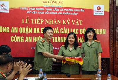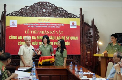 Tiếp nhận kỷ vật của Công an quận Ba Đình và CLB sĩ quan hưu trí TP Hà Nội (23/07/2014)CAND - Ngày 22/7, BTC Cuộc vận động “Sưu tầm và tuyên truyền kỷ vật lịch sử CAND” của Bộ Công an đã tổ chức lễ tiếp nhận kỷ vật của Công an quận Ba Đình và một số sĩ quan CLB sĩ quan hưu trí TP Hà Nội. Các sĩ quan hưu trí TP Hà Nội và những kỷ vật hiến tặng cho BTC Cuộc vận động “Sưu tầm và tuyên truyền kỷ vật lịch sử CAND”. Công an quận Ba Đình đã trao các hiện vật đã gắn bó với lực lượng Công an Quân Ba Đình trong công tác giữ gìn ANTT và ATXH nhiều năm liền, gồm côn sát, dùi cui điện và súng nhựa. Cũng trong buổi lễ, CLB sĩ quân hưu trí TP Hà Nội cũng trao tặng nhiều kỷ vật có giá trị: Đại tá Bùi Văn Chiểu, nguyên Giám thị Trại giam Tân Lập, V26 - Bộ Công an, đã tặng BTC chiếc Huy hiệu của Trường Nâng cao trình độ cảnh sát trại giam Liên Xô tặng ông năm 1984 và chiếc điều cày do phạm nhân làm tặng ông vào năm 1980. Trung tá Trần Văn Nho, nguyên Phó phòng Cảnh sát kinh tế (Công an TP Hà Nội) tặng BTC Cuộc vận động một kỷ niệm kháng chiến cùng một Huy hiệu mà Cảnh sát Liên Xô đã tặng đồng chí. Trung tá Nguyễn Tiến Chúc, nguyên Đội trưởng Đội hành chính quảnh trị và tổ chức đoàn nghệ thuật (CA TP Hà Nội) tặng Quyết định của Giám đốc Sở Công an Hà Nội cử ông khi đó là cán bộ Công an khu Hoàn Kiếm, giữ chức Phó đồn Công an số 11. Trung tá Nguyễn Hữu Nghị, nguyên Đội trưởng Đội Trật tự giao thông (Công an Hai Bà Trưng, Hà Nội) tặng BTC Cuộc vận động một Kỷ niệm chương “Vì chủ quyền an ninh biên giới” và Kỷ niệm chương Kỷ niệm 50 năm giải phóng Thủ đô.